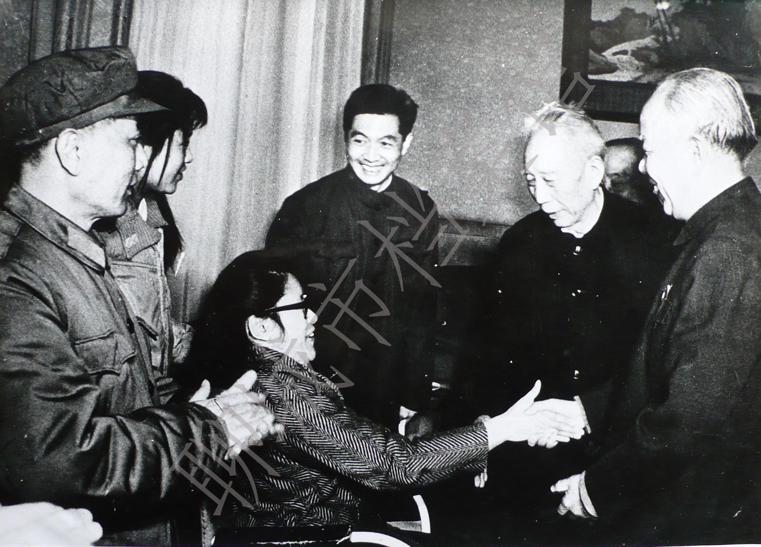 此照片为1983年共青团中央授予张海迪“优秀共青团员”称号前夕,领导人接见她时的照片。照片上从右起依次为:万里、王震、胡锦涛、张海迪。